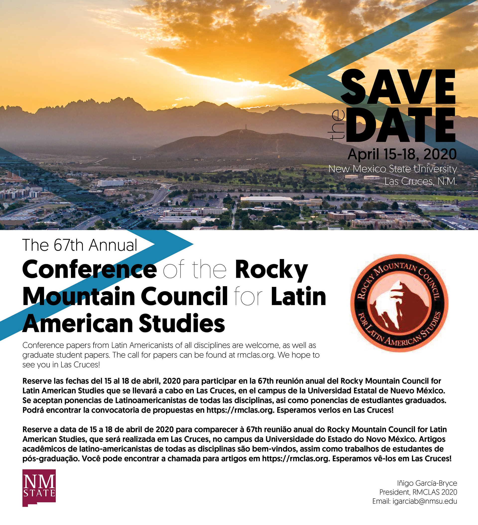 Print and email advertisement for the 67th annual RMCLA conference translated into Portuguese and Spanish.